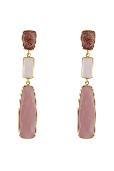 The Aspen Earrings by Bianc feature a striking trio of gemstones in warm, tonal hues. From a textured Strawberry Quartz stud to a soft Brazillian Rose Quartz centre and an elongated Guava Quartz drop, all set in 18k gold plated sterling silver. Elegant and elongating, theyre the perfect piece to elevate your evening look or add a pop of sophistication to daytime styling.