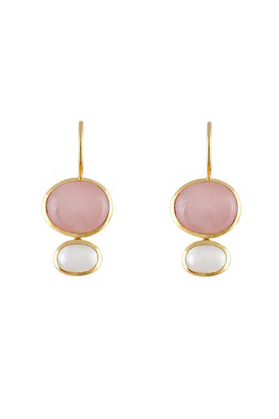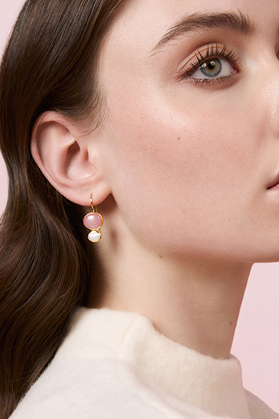 The Cubism Earrings by Bianc feature two primary gemstones, Guava Quartz in an oval setting, and freshwater pearl in a smaller round setting below, set and suspended in 18k gold plated sterling silver. These earrings are the perfect blend of modern design and timeless charm, ideal for those who love effortless sophistication.