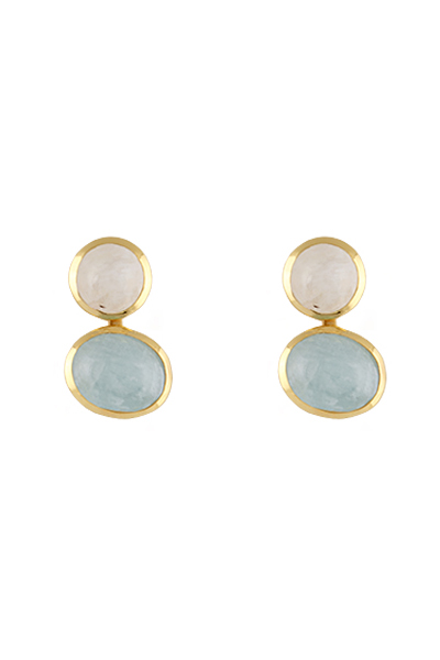 The Motif Earrings by Bianc feature a soft pairing of serene Rainbow Moonstone and Milky Aquamarine gemstones set in 18k gold plated sterling silver. The dual-stone design creates subtle movement and a graceful silhouette that feels both modern and timeless. Perfect for adding a gentle hint of colour to your everyday wardrobe or special occasions.