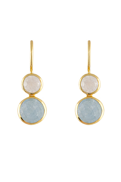 The Prism Earrings by Bianc feature a delicate duo of Rainbow Moonstone and Milky Aquamarine gemstones, set in 18k gold plated sterling silver. The soft blush and icy blue tones create a serene and luminous pairing, perfect for adding a refined pop of colour to your everyday look or a subtle statement for evening wear. Lightweight and easy to wear, these timeless drops bring a sense of calm beauty to any outfit.