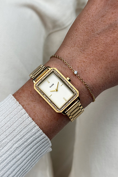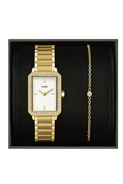 This CLUSE gift box for women combines the Fluette women's watch with the gold coloured Chain bracelet. The Fluette watch features a white coloured dial, 30.6 mm case with cubic zirconia stones and 3-link stainless steel strap. Pair the watch with the complementary gold coloured bracelet.