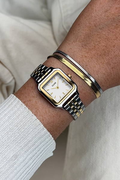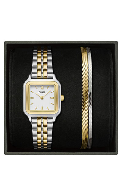 This CLUSE gift box for women combines the Gracieuse Petite women's watch with the a gold and silver matching bracelet. The Gracieuse Petite watch features a white dial, 24 mm gold coloured case and 4-link bicolour stainless steel strap. Pair the watch with the complementary silver and gold coloured bracelet.