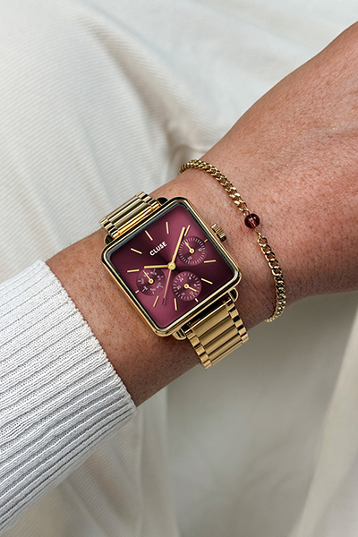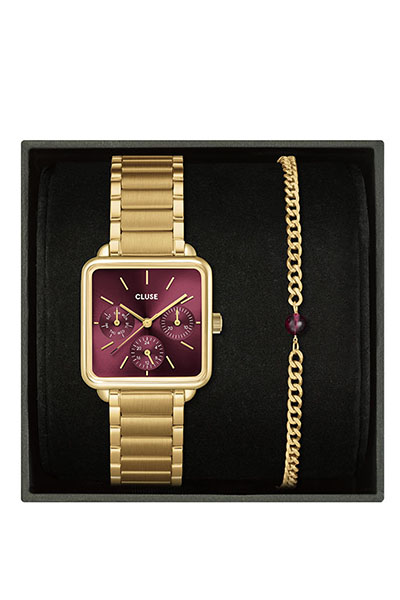This CLUSE gift box for women combines the La Tétragone women's watch with the gold coloured bracelet. The La Tétragone watch features a dark cherry multifunction dial, 30 mm gold coloured case and 3-link stainless steel strap. Pair the watch with the complementary gold coloured bracelet.