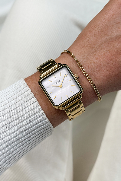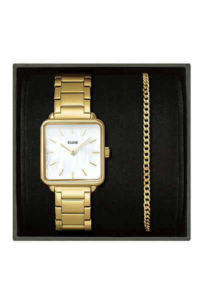 This CLUSE gift box for women combines the La Tétragone women's watch with the gold coloured Curb Chain bracelet. The La Tétragone watch features a white pearl dial, 28.5 mm gold coloured case and 3-link stainless steel strap. Pair the watch with the complementary gold coloured bracelet.
