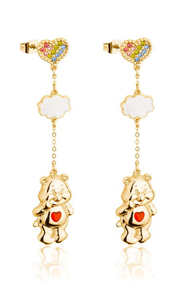 Playfully dangle a piece of childhood nostalgia with these adorable Tenderheart Care Bear drop earrings. Featuring the beloved bear alongside whimsical clouds and crysal rainbow hearts, they're the perfect accessory to spread caring vibes wherever you go. A charming touch of Care-a-Lot for your everyday style!