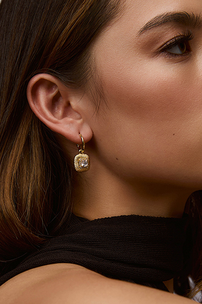 The Christina Earrings by Zahar feature a textured gold drop with a cushion-cut cubic zirconia centre, surrounded by delicate pavé detailing. Timeless and elegant, theyre perfect for special occasions or everyday luxury.