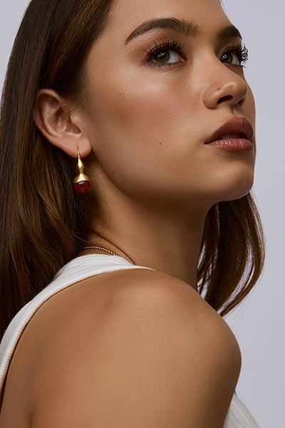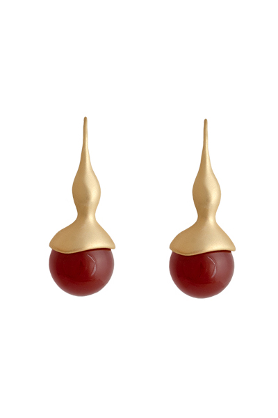 The Paisley Earrings by Zahar feature a sculptural matte gold top flowing into a bold, high-gloss red sphere. A statement in contrast and silhouette, these earrings are perfect for the creatively inclined and confidently styled.