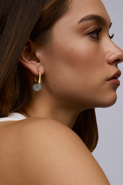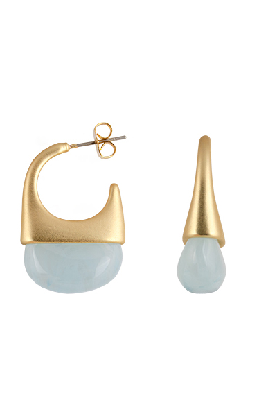 The Poppy Earrings by Zahar feature a gold arc that cradles a smooth aqua-toned resin drop. Artful and unexpected, this design is modern and playfulperfect for adding a creative edge to any outfit.