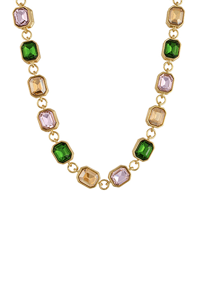The Rosalie Necklace by Zahar features a sequence of emerald-cut glass stones in playful shades of green, pink, and champagneeach set in polished gold-toned bezels. A joyful statement piece that instantly elevates your look.