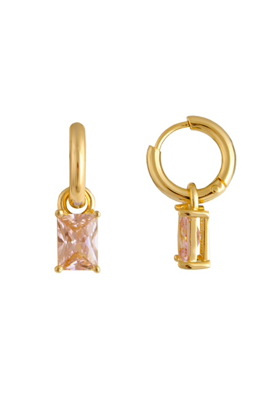 The Tiana Earrings by Zahar feature a mini gold hoop with a suspended emerald-cut champagne stone. The faceted drop catches the light beautifully, adding a fresh pop of colour to your everyday stack or evening look.